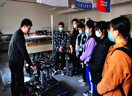 在哈工大(威海分校)的海空天一体化实验室里,该实验室指导教师姚统向我校师生详细介绍了实验室的科研成果、参赛团队、发展计划等一系列情况,展示了哈工大师生自己研发制作的水下机器人、飞行机器人以及参加各类比赛的专用机器人。HERO竞技机器人团队机甲大师项目副队长、哈工大大三学生张延松还带领自己的团队和我校师生进行了深入交流,向我校学生展示了比赛的精彩视频,还为同学们讲解了自己从接触机器人项目萌发兴趣,到参加自主招生获得降分录取,再到率领团队在全国大赛中夺冠的经历以及相关的心得与经验。