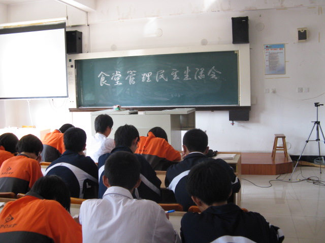 2012年食堂管理民主生活会,参加人员有:高一级部和高二级部的生活委员,他们对第一餐厅、第二餐厅进行量化打分,以及学生对餐厅存在的问题提出了合理意见。
