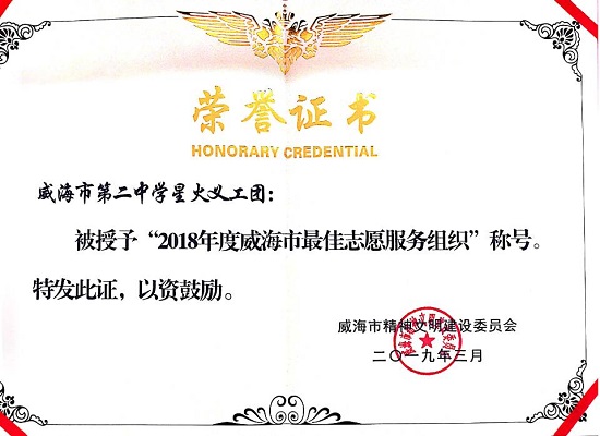 近日,威海市精神文明建设委员会表彰了2018年度威海市19个最佳志愿服务组织,威海二中“星火义工团”志愿服务队荣获“威海市最佳志愿服务组织”称号,同时,也是市直教育系统中唯一获此殊荣的单位。
