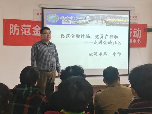 为充分发挥党员参与社区建设、服务社区居民的先锋模范作用, 3月19和20 日,威海市第二中学委员会组织部分党员分别到威海市金线顶社区、金城社区参加“防范金融诈骗--党员在行动”主题党日活动。
