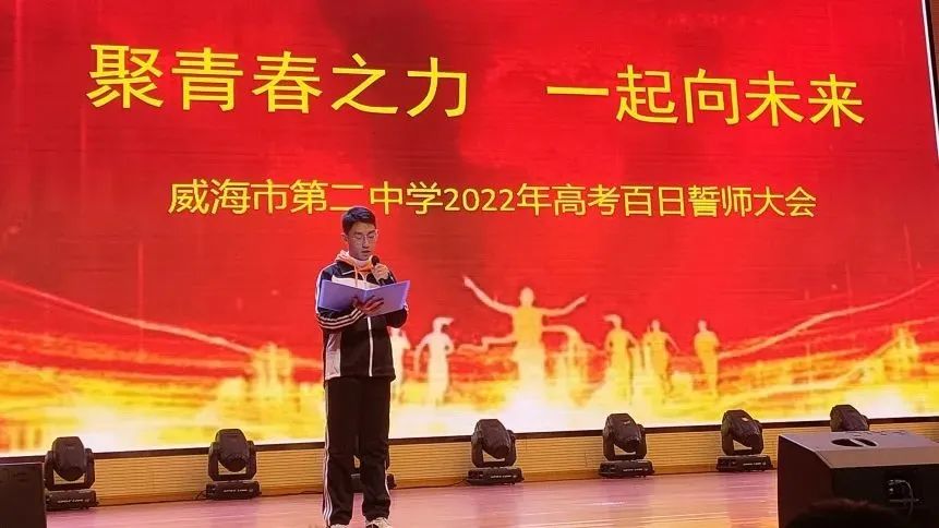 厉兵秣马,六月出征,2022年备战的号角已响彻云霄。为了激发高三学子的拼搏精神, 增强迎战高考的信心,在距高考还有105天的日子里,威海二中举行高考百日誓师大会。大会的主题为“聚青春之力 一起向未来”。