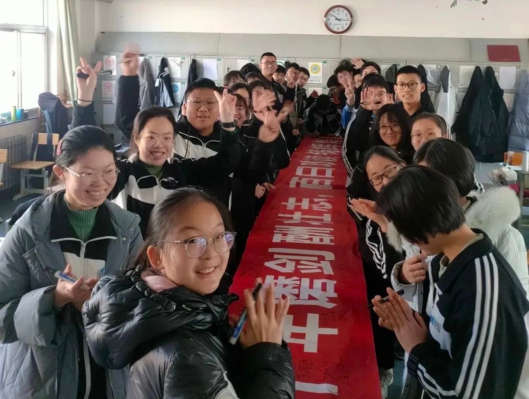 大会结束后,老师和学生纷纷把自己的名字写到了各班级定制的条幅上,并把条幅挂在了各班级教室,以便时刻提醒自己珍惜时间,认真备考。