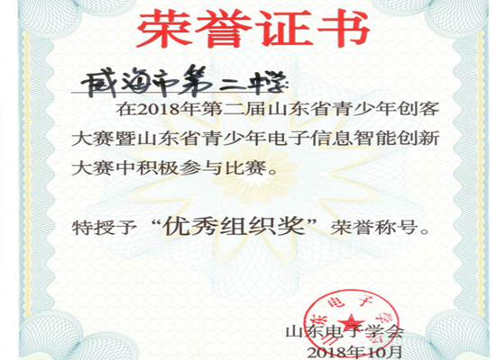 我校派出代表队参加该项赛事的两个小项比赛,选手们发挥出色,满载而归。其中,高二22班学生金伟宇、孙宏宇组成的“飞宇战队”,以及高二22班王蔚晨和高二21班王高威组成的“黑马战队”参加了“MakeX机器人挑战赛”,高三18班学生杨斯潆和高二25班于腾昊参加了“物联网创意赛”。 杨斯潆和于腾昊进入了山东省决赛参加现场答辩,最终杨斯潆获得山东省一等奖,金伟宇、孙宏宇组成的“飞宇战队”在MakeX机器人挑战赛中获得山东省二等奖、王蔚晨和王高威组成的“黑马战队”获山东省三等奖。我校获“优秀组织奖”荣誉称号,我校教师毕胜杰被评为优秀指导教师。